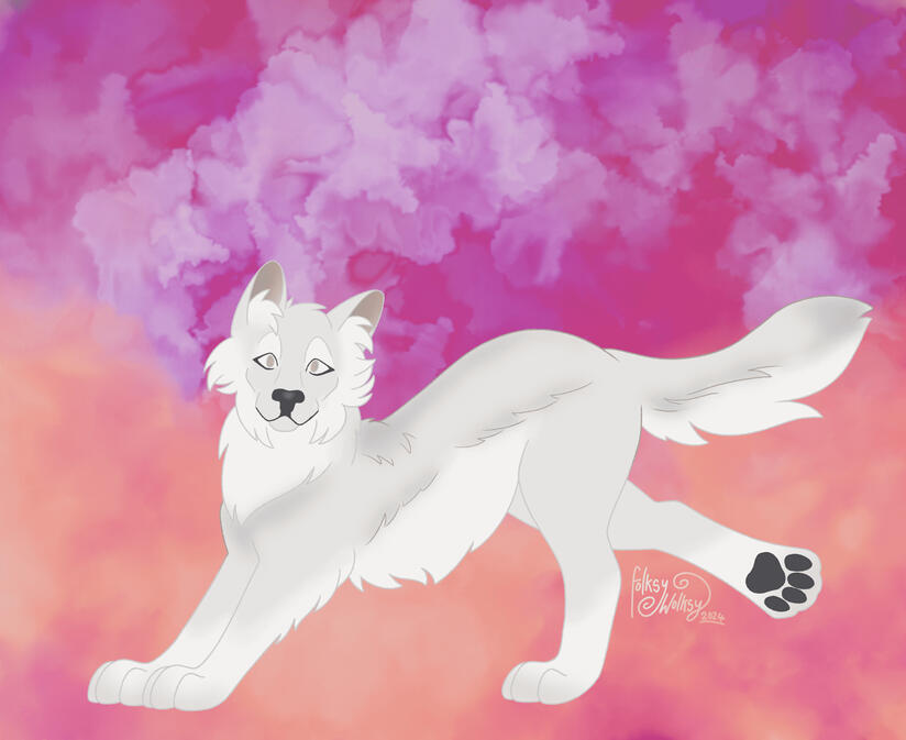 Upon first meeting Meiling, many can take note of how small she is when compared to other wolves and dogs. Her frame is lithe and lean, containing very little muscle and a few of her ribs are visible through her dense coat. All around her build is more suited to agility and stamina, unable to deal heavy blows in combat or have a high endurance. Her fur is quite fluffy and thick and is almost completely white save for the cream hues on the inside of her ears.Mei's tail isn't too densely covered in fur but it's of a medium length. The she-wolf's nose and paw pads are a dark charcoal color, well suited to her black nails. But her most notable trait has to be her eyes, as they're always open wide and filled with an intense wonder. They're also brown but covered in a clouded cornea, making them lighter in hue than normal.Apparel-wise the white wolf chooses to stick to the essentials, or they are in her eyes at least, which consist of a stone heart-shaped necklace she has yet to receive, a bag for herbs and salves, and a large flower basket capable of holding a good-sized bouquet. Due to her line of duty, she never goes anywhere without her bag and upon being gifted to her, the necklace became an everyday staple in her attire.